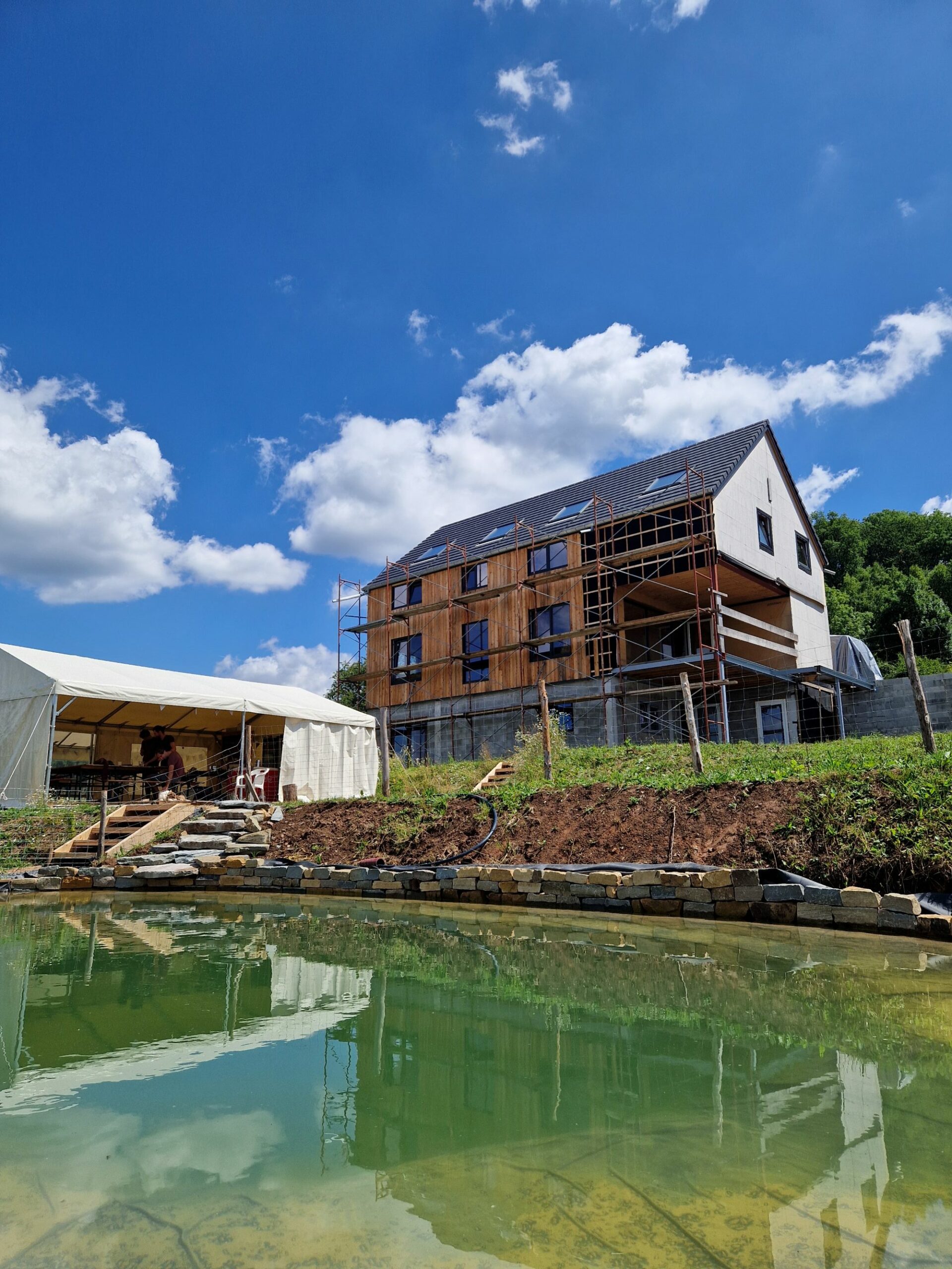 Auto-construite en ossature bois, terre paille, cette maison écologique permettra de poursuivre les activités de l’éco-lieu en améliorant l’accueil des publics et l’offre d’activités proposées sur le site.